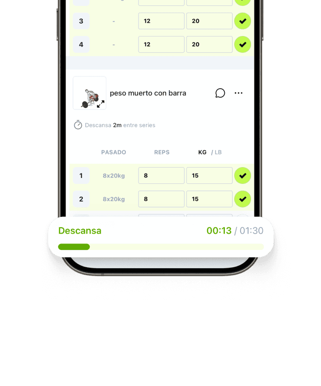 El descanso es clave. La app muestra a tus clientes un temporizador de descanso entre series.
