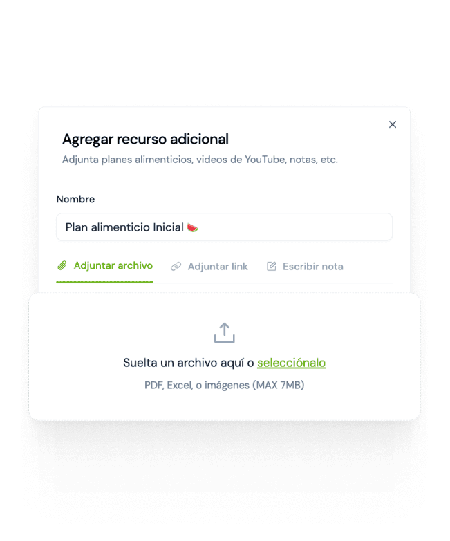 Carga PDFs, links y otros recursos en la app de tus clientes. Como planes alimenticios.