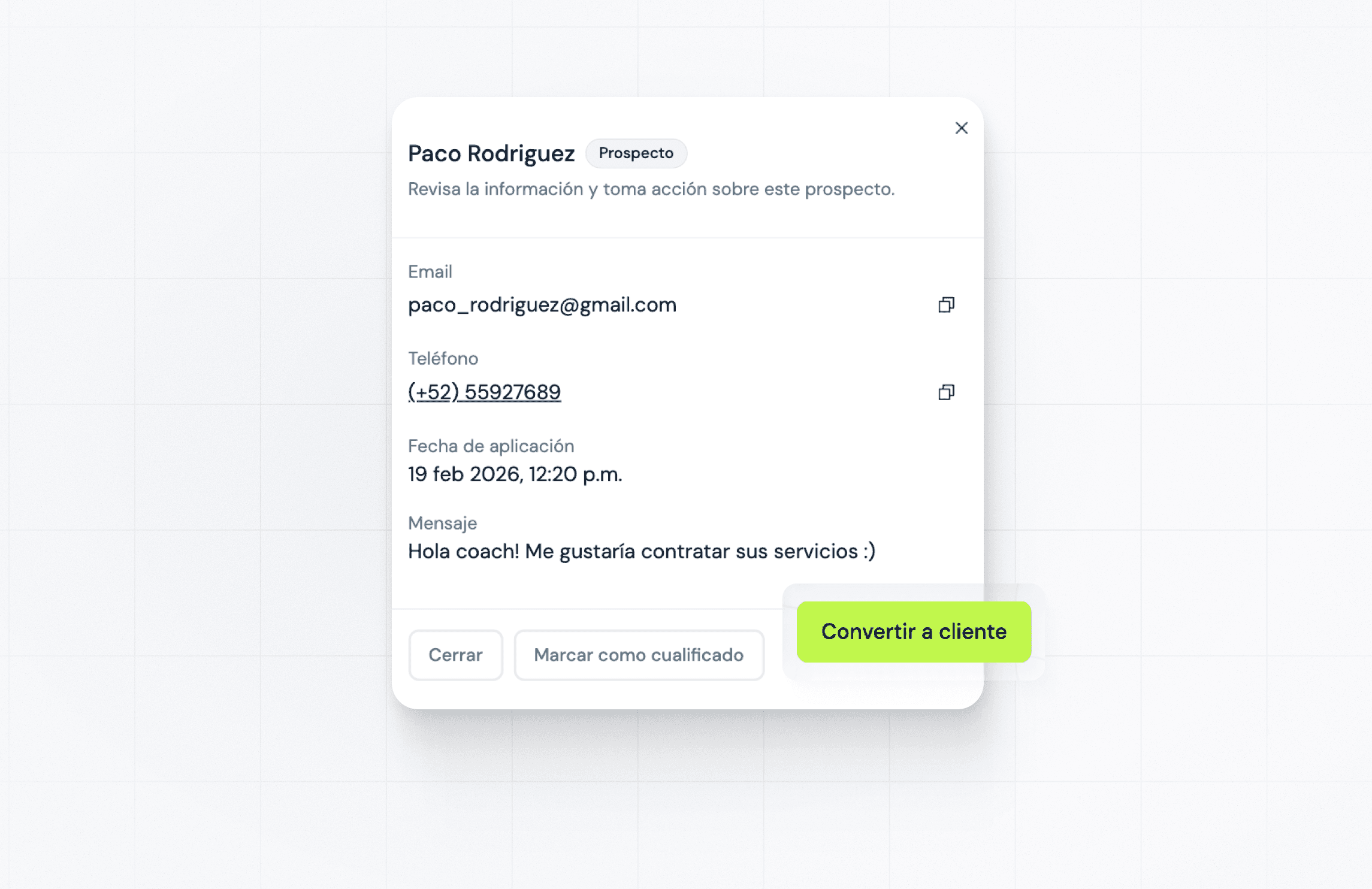 Convierte un prospecto en cliente activo directamente desde la app. Sin cambiar de plataforma ni perder información.