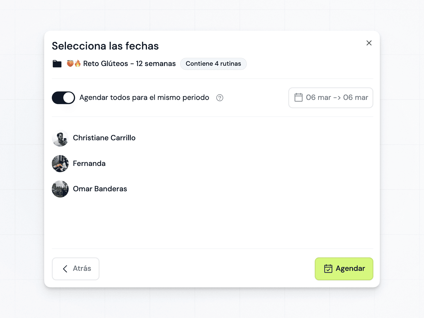 Crea plantillas de rutinas reutilizables y asígnalas a múltiples clientes. Ahorra horas de trabajo cada semana sin sacrificar la personalización.